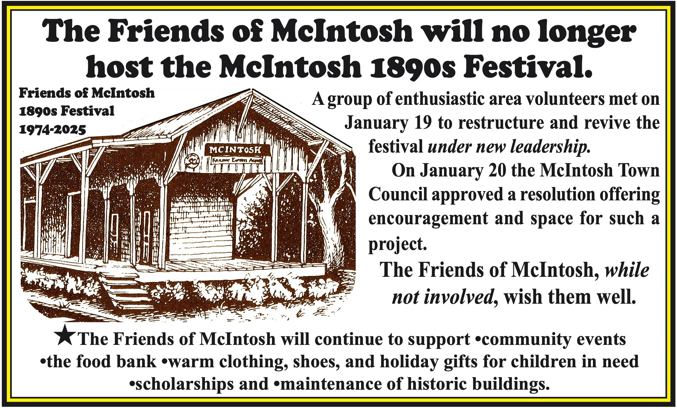 Residents of the town of McIntosh are welcome to join the Friends of McIntosh. Membership is as varied as McIntosh’s population. Generally, members want to participate in things that preserve town history, make the town more beautiful, and make it a happier place to live. They are the town’s cheerleaders. And they’re also hard workers. While much of the Friends’ work is concentrated in the McIntosh 1890s Festival (almost everyone has at least one job), members work throughout the year to keep the organization aligned with its mission.