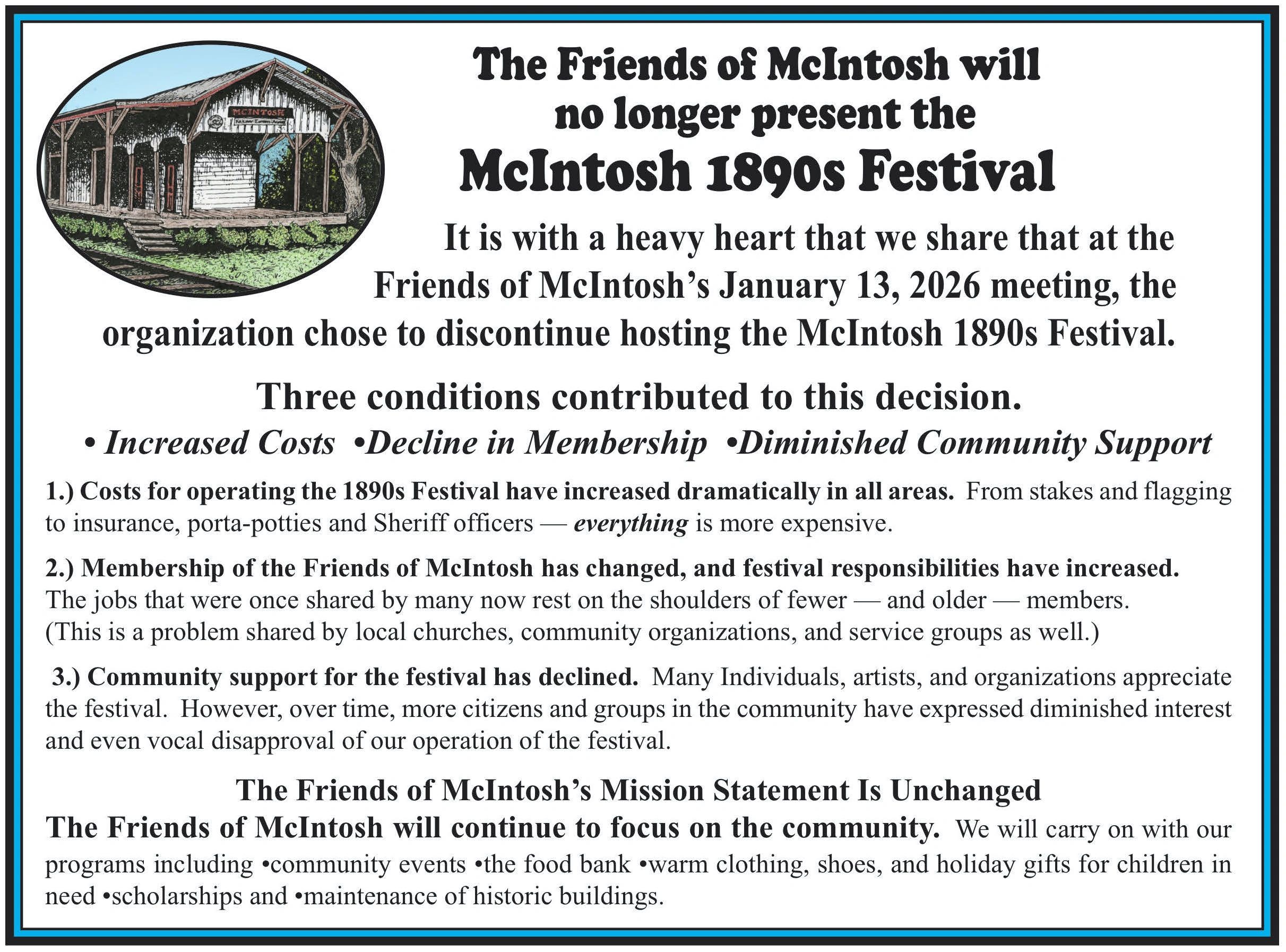 The Friends of McIntosh, Inc. is a benevolent, non-profit organization [501(c)(3)] chartered on November 5, 1973. Its purposes include to preserve and enhance the natural and historic beauty of McIntosh; to support cultural, educational, and recreational activities; to strengthen the health and well-being of our neighbors; and to encourage friendship, community spirit and understanding among people of all ages in McIntosh.