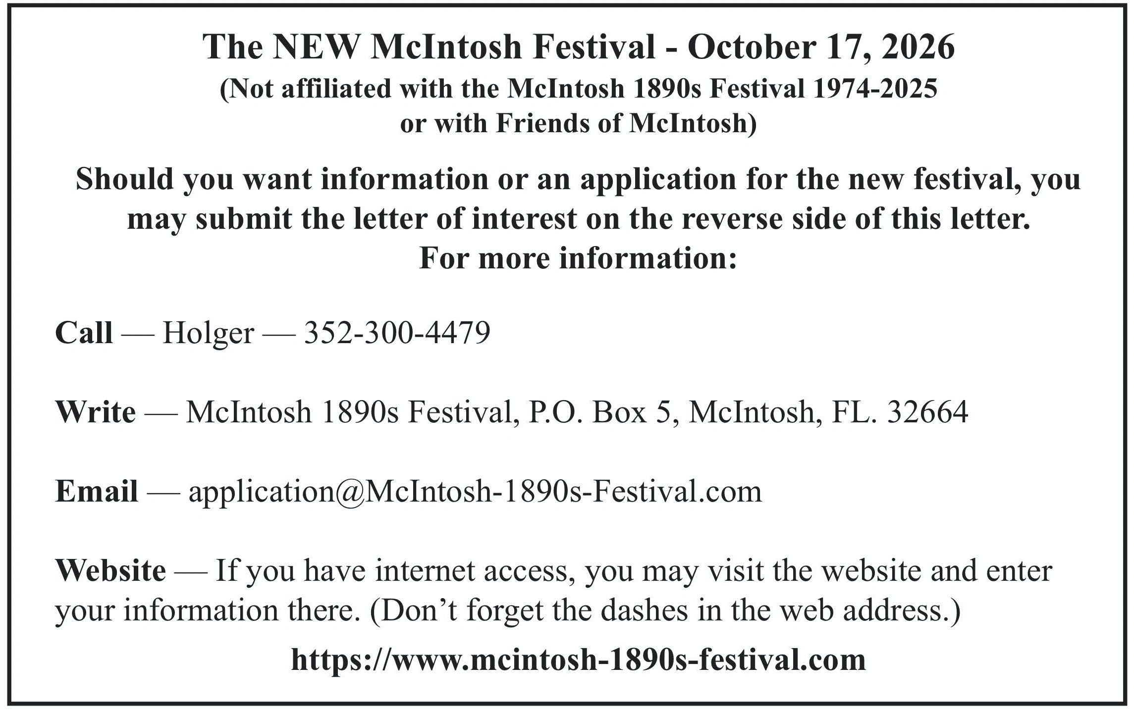 The Friends of McIntosh, Inc. is a benevolent, non-profit organization [501(c)(3)] chartered on November 5, 1973. Its purposes include to preserve and enhance the natural and historic beauty of McIntosh; to support cultural, educational, and recreational activities; to strengthen the health and well-being of our neighbors; and to encourag